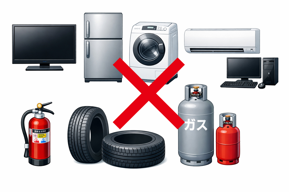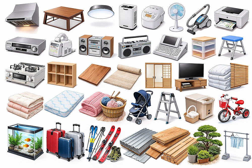 換気扇/こたつ(板除く)/照明器具/除湿器/炊飯器/扇風機/掃除機/プリンター/ビデオデッキ/布団乾燥機/ミニコンポ/ラジカセ/ワープロ/衣装箱/いす(応接除く)/ガス台/カラーボックス/こたつ板/じゅうたん/建具/テレビ台/布団/ブラインド/ベビーマットレス/毛布/編み機/乳母車/脚立/米びつ/三輪車/水槽/スーツケース/スキー用具/トタン/ベニヤ/木材・庭木類/物干し竿