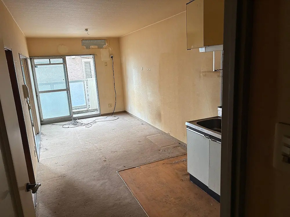 物件は築約30年の賃貸マンション(1DK)。発見までに時間が経過していたため、室内には異臭が発生し、体液の浸透が確認される状態でした。